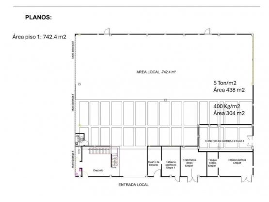 La altura libre del mezanine es de 3,20 m, suministro electrico 75 kvas